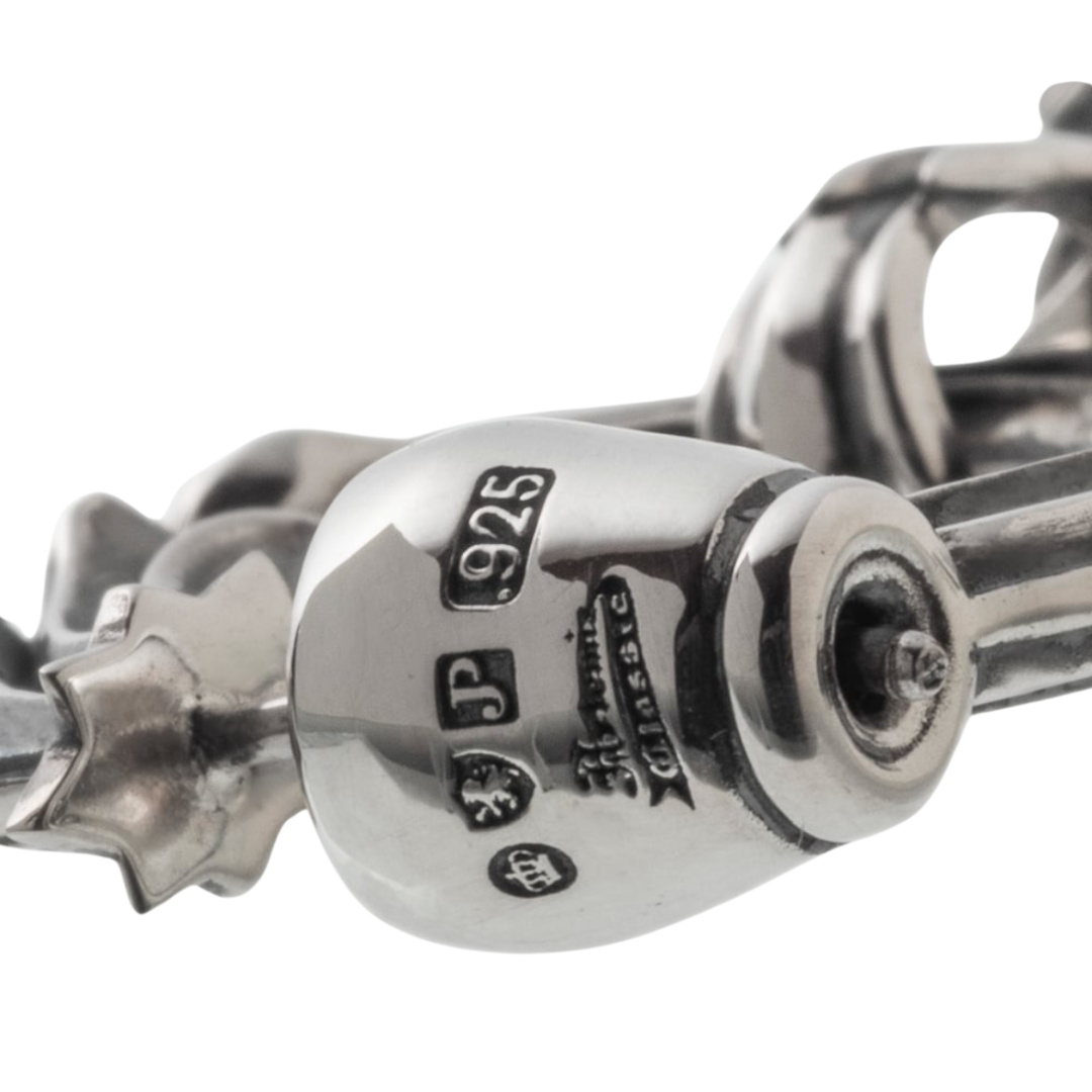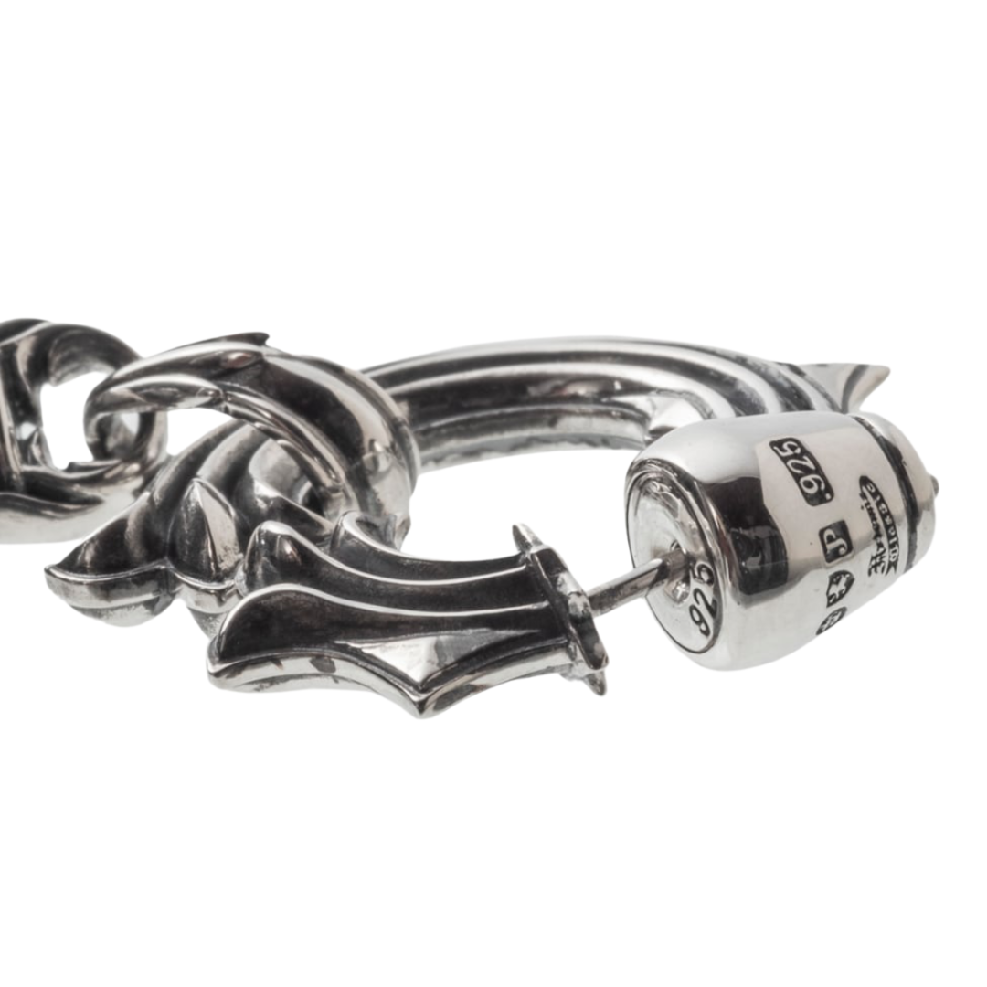 視線を奪うトリッキーなフープピアス。キャッチ側から立ち上がる立体構造は、耳たぶを抱くように回り込み、フルール・ド・リスの優美な曲線で気品を描きます。そこから銀の牙を思わせるスパイクがドロップし、揺れるたびに燻しの陰影と鏡面の艶がコントラストを生み、表情をドラマティックに変化。繊細な彫り込みが光を細やかに拾い上げ、ボリュームは程よく、着け心地は驚くほど快適です。キャッチにはブランドロゴと“925”、さらに三つのホールマークを刻印。確かな品質と美意識を物語ります。ブランドの意匠を精確に再現し、提携アトリエが手業で丹念に制作。一本でコーデの主役に、片側コーデやペア使いでも印象的。エレガンスとエッジを一つに融合した、現代的モダン・クラシック。ギフトにも最適です。