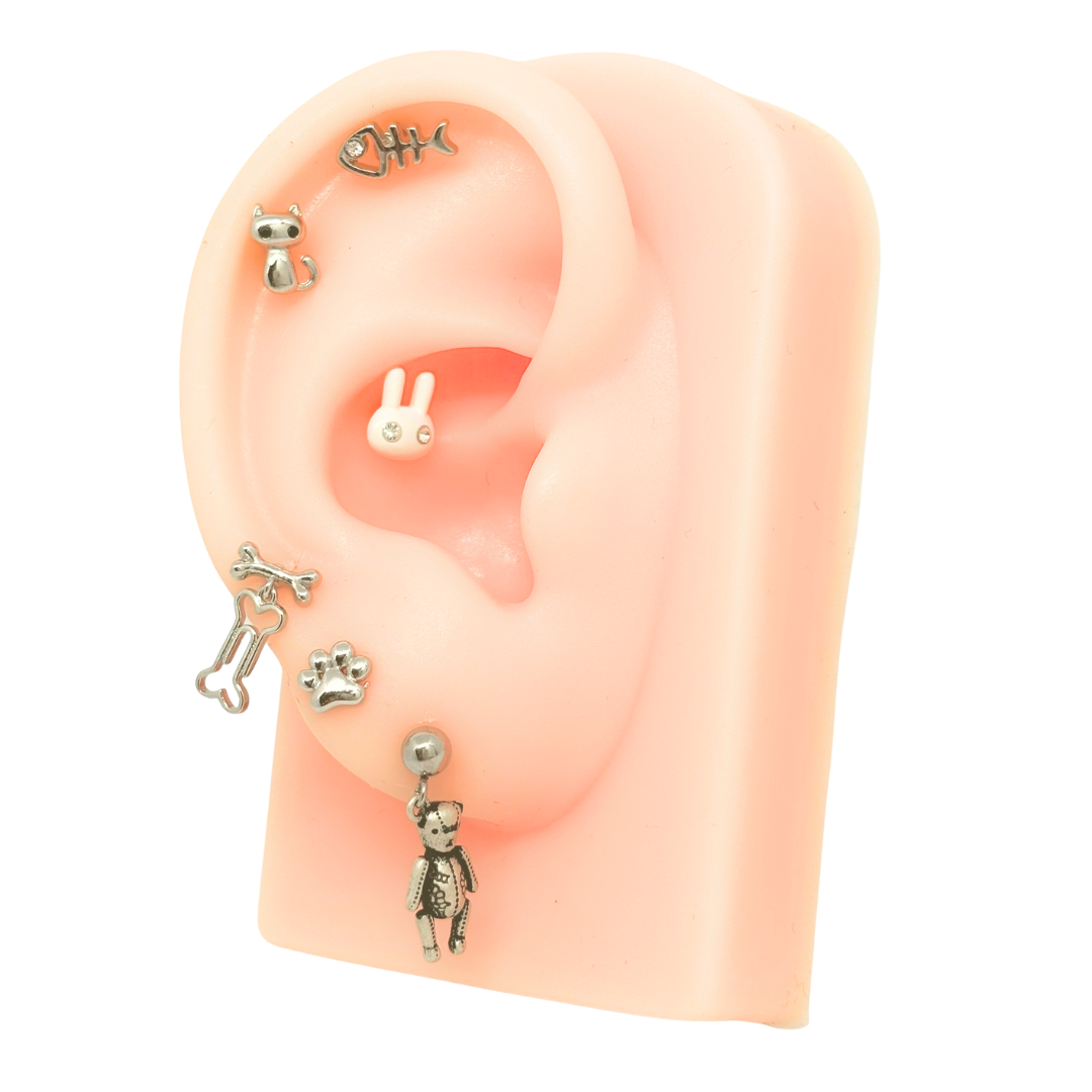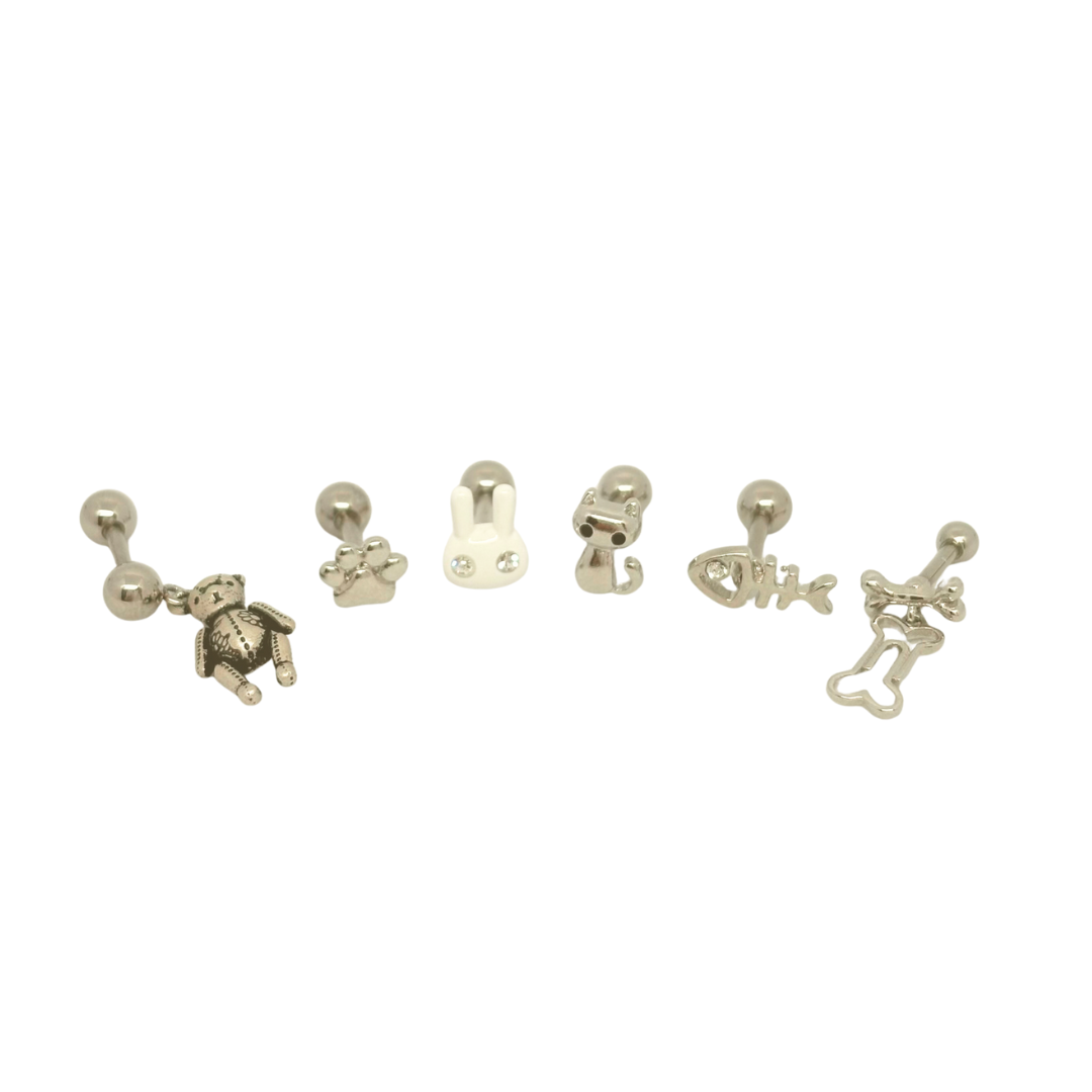 付属品としてバーベル16G/8mmシャフトが2本、ラブレット16G/6mmシャフト1本、ラブレット16G/8mmシャフト1本、16G/4mm玉2個が付きます。ご自分の耳の厚みに合わせて付け替えていただけます。ご不明な点がございましたら店舗までお問い合わせください。